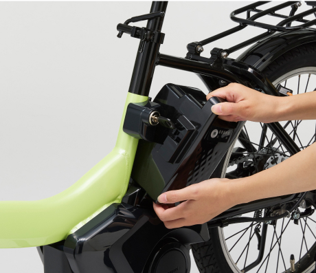 バッテリーはワンタッチで取り外し可能。 自宅での充電ができ、容量の80%までは急速充電に対応しています。
