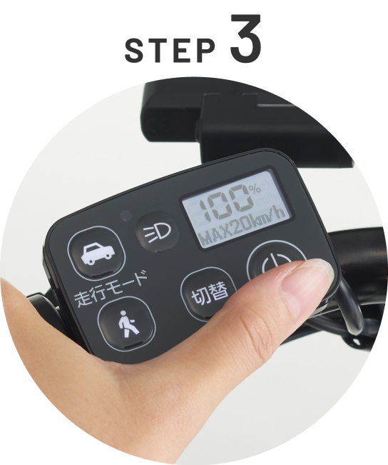 手元スイッチで電源をON。 車道モード(20km/h)と歩道モード(6km/h)を切り替えられます。 ※歩道モードは「自転車歩道通行可」の標識がある歩道のみ走行可能です。